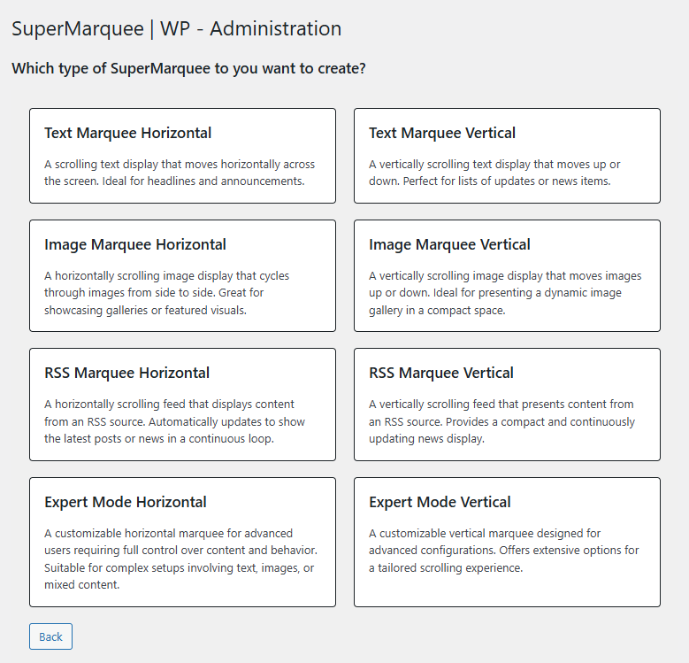 - On the next page choose the type of SuperMarquee you want to create (refer to screenshot below)