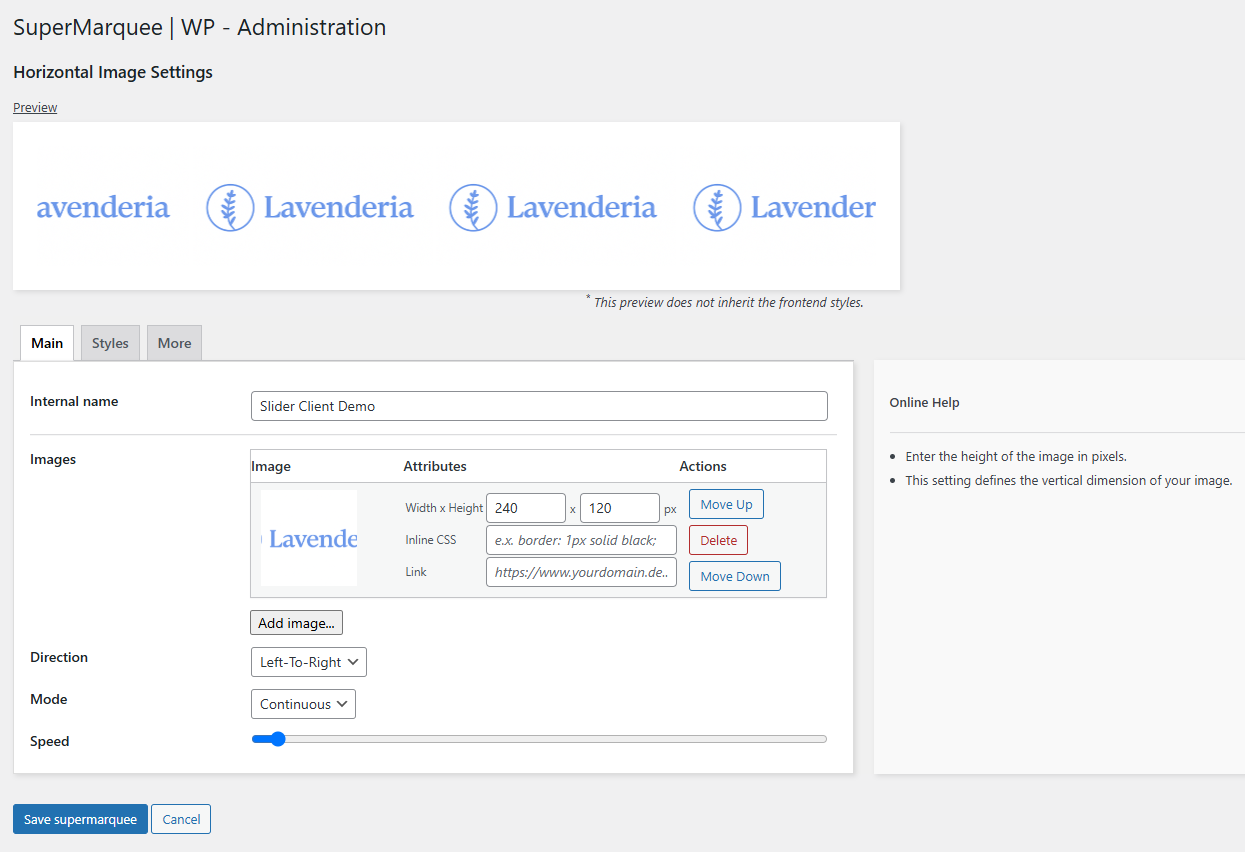 The plugin comes with an intuitive admin interface in the WordPress admin backend. It can be accessed via the menu item called "SuperMarquee" in the left sidebar.