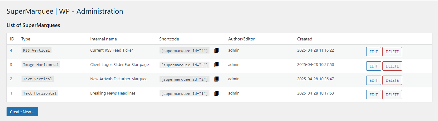 The default page of the SuperMarquee | WP plugin show the list of all created SuperMarquee instances. The list offers you the possibility to edit or delete the respective instance.
